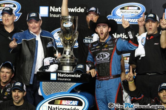 Meanwhile, Austin Dillon fought back from having an ill-handling car early to win the 2013 NASCAR Nationwide Series Championship, three points ahead of Sam Hornish Jr.