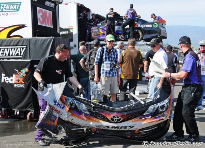 Logano and Hamlin were battling side-by-side as they went down the backstretch and once they entered turn 3, everyone watching the race knew what was going to happen. Logano slid up into Hamlin and both drivers wrecked while Busch sneaked by on the outside to grab the victory. Logano was able to salvage a third-place finish out of the race following his wreck, but Hamlin was less fortunate. As you all know, Hamlin crashed hard into the concrete wall prior to pit entrance and all he could murmur out was “my back, my back, my back.” Hamlin was seriously hurt and Logano had gotten his “pay-back,” but this was much worse than it should have been. The race at Fontana sure wasn’t the calm race we thought it would be and the action didn’t end on the track.