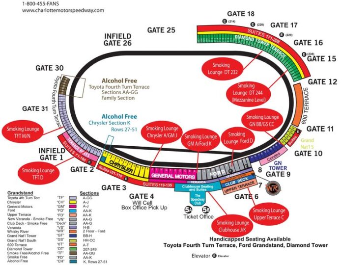 Charlotte Motor Speedway Communications Manager, Jonathan Coleman, said in an email this morning that, “..smoking will still be permitted in open-air campgrounds, parking lots, hospitality and souvenir display areas. “ Mr. Coleman also noted that the policy change is “..a result of extensive fan feedback over the last several years.”
