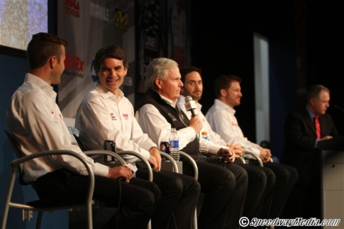 Next on the agenda was the short trip to Hendrick Motorsports where media representatives were greeted by what is a stable group of drivers for 2013, including Kasey Kahne, Jeff Gordon, Jimmie Johnson, and Dale Earnhardt, Jr. Team owner Rick Hendrick took the stage with his four drivers.