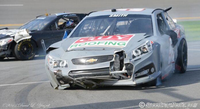Collected in the wreck was Jamie McMurray, Brad Keselowski, Kasey Kahne, Kyle Busch, Jeff Gordon, Joey Logano, Aric Almirola, Regan Smith and Carl Edwards.