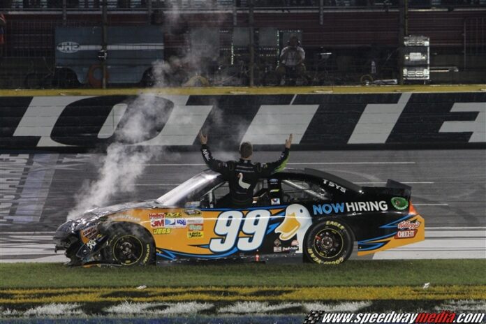 [/media-credit]2011: Carl Edwards would go on and win the 2011 Sprint All-Star Race. The race featured few cautions. David Ragan and Brad Keselowski advanced to the All-Star Race from the Sprint Showdown and Dale Earnhardt Jr. won the Sprint Fan Vote. Late in the All-Star race Kyle Busch began to catch Edwards but came up short and Edwards went on to win the race. During his celebration, Edwards spun through the grass attempting to do a burn out when his car met a drainer in the infield; Edwards heavily damaged his front end.