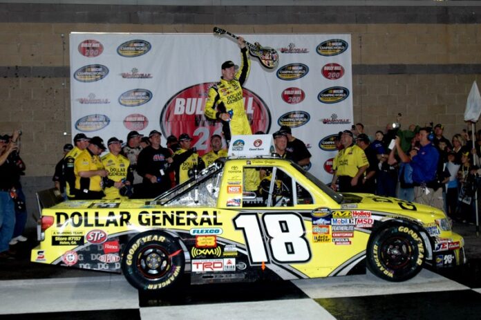 Kyle Busch won the Bully Hill Vineyards 200 in dominating fashion, leading 140 out of 150 laps en route to his team’s third Camping World Truck Series victory in five races in the 2011 campaign, along with his second straight victory in sponsor Dollar General’s backyard. “It was a really good race.” said an ecstatic Kyle Busch. “The guys at the shop did a great job and brought a great piece of equipment out here to the track. The clean air really helped us out most of the race and with about ten to go, Hornaday got a jump on us on the restart and got along-side of our spoiler and took a little air off of me and got around us, but we got a caution and we thought we were in a good position on the restart. So we did the same thing that Hornaday did on the previous restart and we got a good run on him in turns one and two and sailed by him in turn three. It would have been a shame had we lost today. The guys worked so hard, and our pit-stops were great and we wored really hard to come away with the win.”