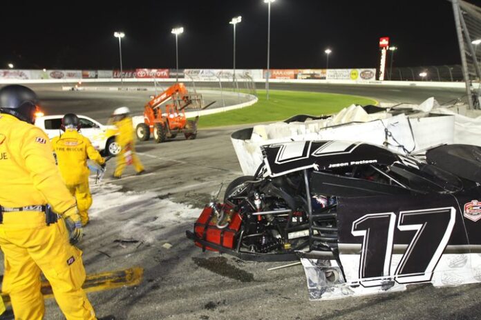 Jason Patison, a driver in the Lucas Oil Slick Mist Super Late Model series at Toyota Speedway at Irwindale, found out first hand as so many driver have in the past just how dangerous this sport can become in the blink of an eye. It wasn’t so much who was at fault, or the circumstances that led up to Patison and fellow driver Dennis Schlarbaum both sliding against the front stretch wall, and hitting the tire and rubber attenuator which is in front of the exit to the track.