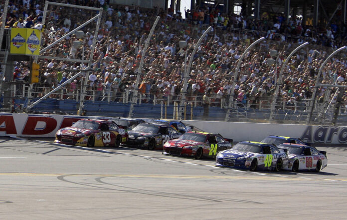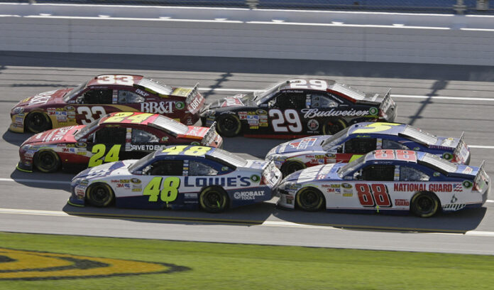 [/media-credit]The race started off with Hendrick power that filled the front two rows with pole sitter Jeff Gordon and Johnson on the front row. Mark Martin started third, Earnhardt Jr. fourth. Those positions left Martin pushing Gordon and Earnhardt Jr. pushing Johnson when the green flag flew.