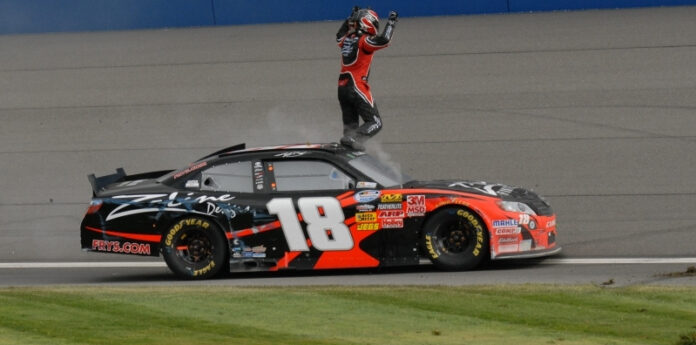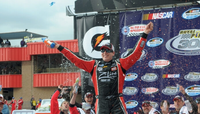 [/media-credit]Kyle Busch opted for two tires on the final pit stop with less than 13 laps remaining in Saturday’s Nationwide Series (NNS) race at Auto Club Speedway and was able to hold off Carl Edwards and Kevin Harvick to win his third straight NNS race.