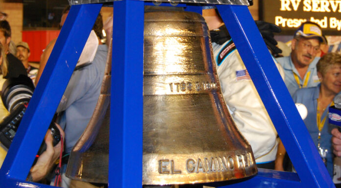 [/media-credit]The bell ceremony has become a time honored tradition, at the Auto Club Speedway, that represents a significant portion of southern California history. El Camino Real is Spanish for The Royal Road also known as The King’s Highway. It was a 600 mile stretch of road that connected missions from San Diego to the California wine country in Sonoma. Between 1683 and 1834 a series of religious outposts were constructed, approximately 30 miles apart from each other, to facilitate overland travelers. In 1892, in lieu of modern day road signs, the route was marked by a series of bells. From 1920 to 1931 the Auto Club of Southern California donated the resources to care for those bells. That would be the same Auto Club that will be treating race fans to the NASCAR weekend at the Auto Club Speedway.