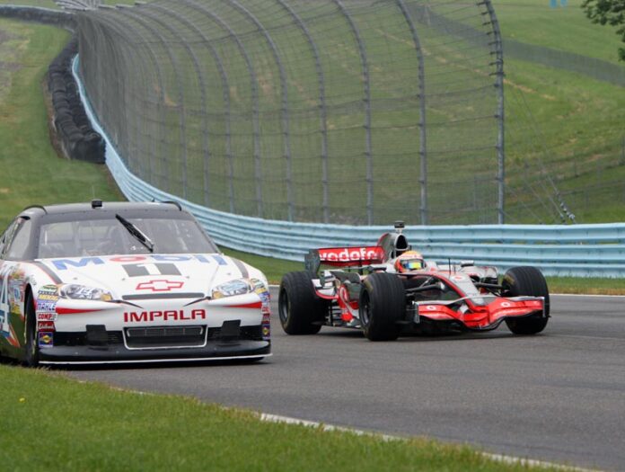 On a dark and dreary day at the picturesque Watkins Glen International Speedway Mobil 1 racers swapped cars. At the end of it all they were nothing but smiles as each driver took their own car around the track for 3 or 4 laps and then they drove each others cars. The drivers were NASCAR’s Tony Stewart and F-1’s Lewis Hamilton.
