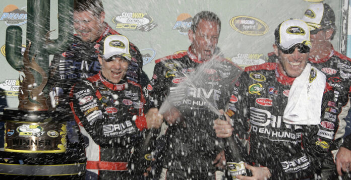 [/media-credit]Surprising: In contrast to the youngest winner, 20 year old Trevor Bayne, celebrating in Victory Lane after his Daytona 500 win last week, a 39 year old veteran driver was finally able to celebrate a victory, ending a 66 race winless streak. After receiving a big bear hug from team owner Rick Hendrick, the driver of the No. 24 Drive to End Hunger Chevrolet, Jeff Gordon, stood relieved and overwhelmed with emotion in Victory Lane.