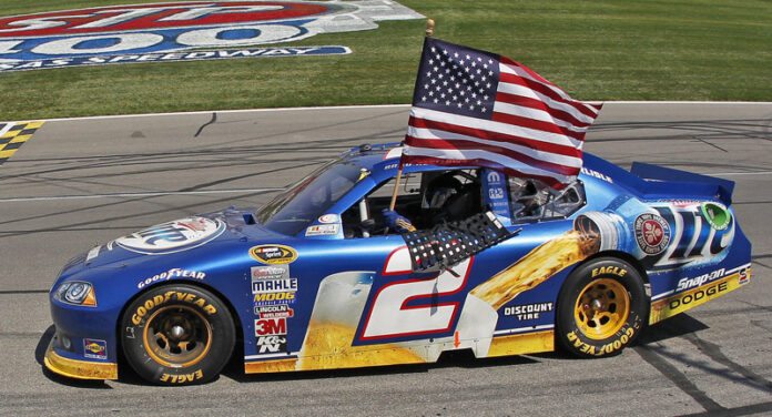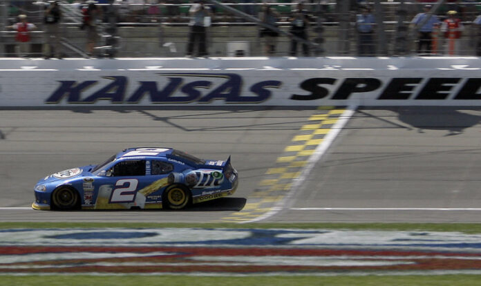 [/media-credit]Brad Keselowksi conserved just enough fuel and held off Dale Earnhardt Jr. on Sunday to win the STP 400 at Kansas Speedway.