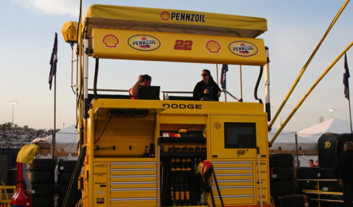 Being atop the No. 22 Pennzoil pit box, or better known as the “war wagon”, is an experience in itself. The short climb straight up to the seating area in the pit box is just an undertaking like no other. You know it’s a special place. You can feel the action and you have a view like no other.