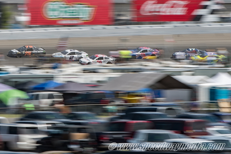 Multiple cars exit turn two during racing action in the Sprint Cup FireKeepers Casino 400 at Michigan International Speedway, June 12, 2016. Photo by Tim Jarrold.